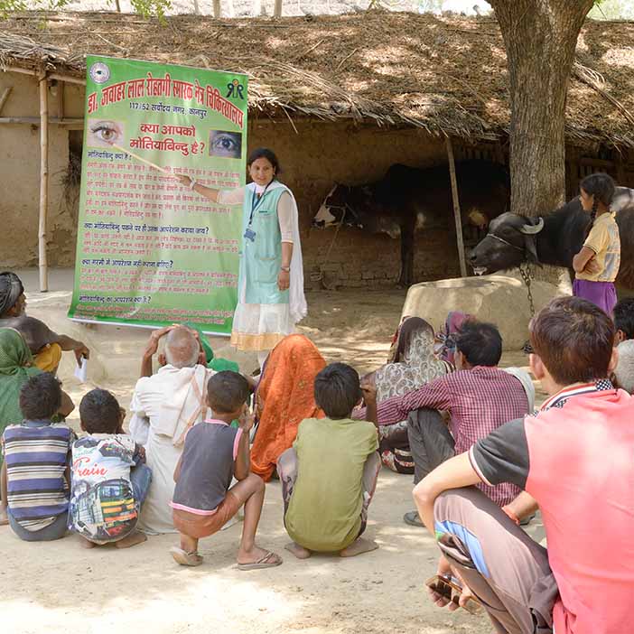 CHWs organize screening camps in centrally located villages. At these outreach camps, staff from our partner hospitals re-examine those who were identified with eye conditions during the door-to-door survey
